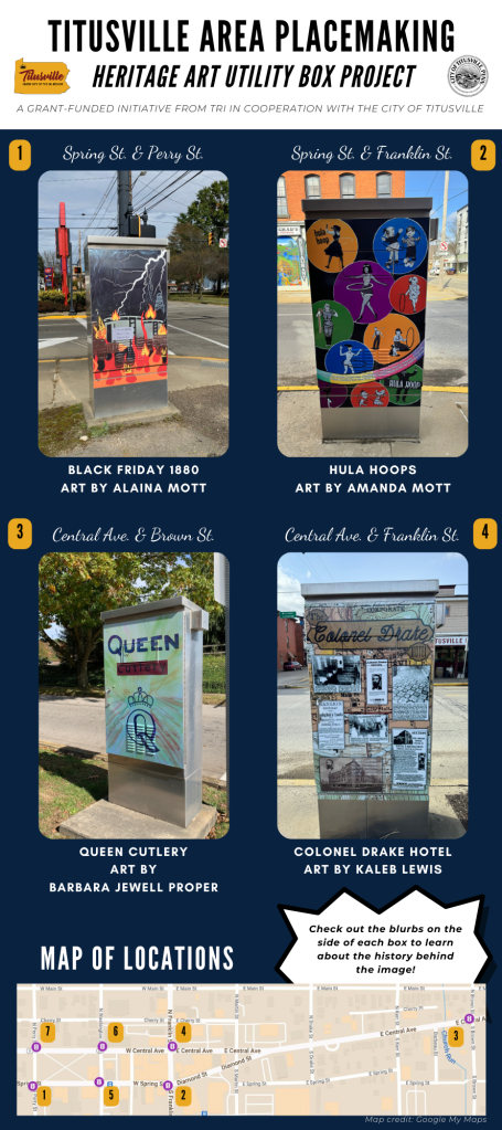 TRI was awarded four grants as a part of Titusville Area Placemaking efforts totaling more than $12,000. These grants funded the following projects: new downtown banners; 7 utility box covers featuring Titusville history; downtown Titusville attraction maps. To read about the history behind each utility box image, check out the narrative document.